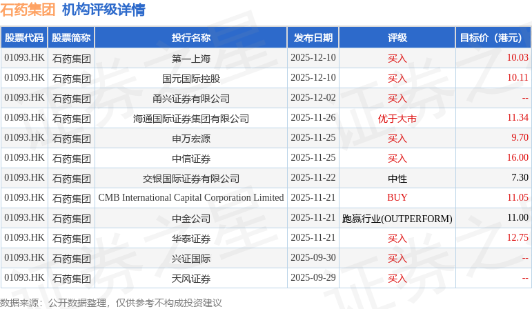 投行对该股的评级以买入为主,近90天内共有8家投行给出买入评级,近90天的目标均价为11.03港元。第一上海最新一份研报给予石药集团买入评级,目标价10.03港元。