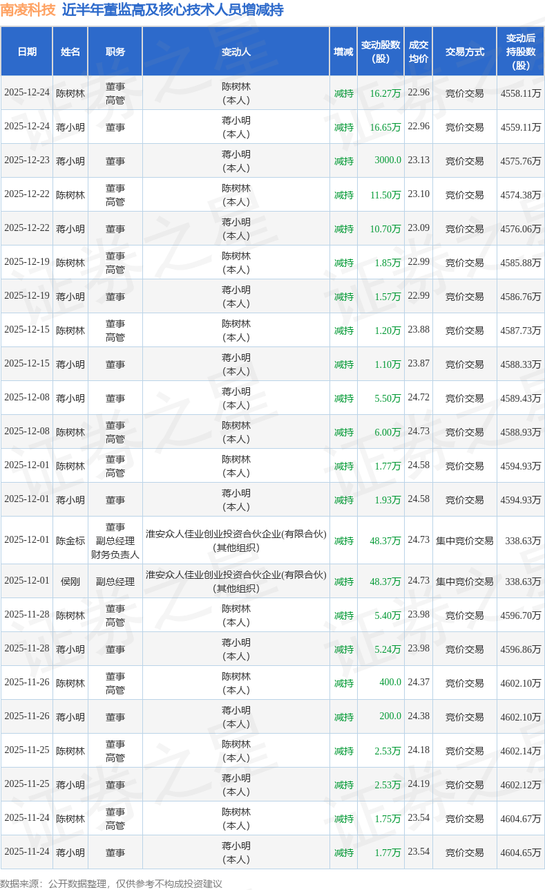 南凌科技近半年内的董监高及核心技术人员增减持详情如下: