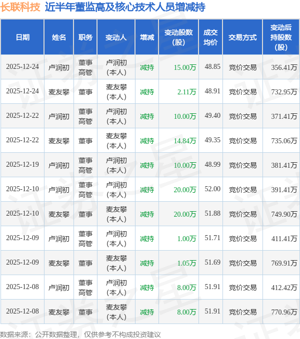 长联科技近半年内的董监高及核心技术人员增减持详情如下: