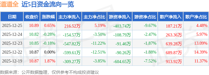 证券之星消息,截至2025年12月25日收盘,道道全(002852)报收于10.89元,上涨0.65%,换手率1.35%,成交量3.85万手,成交额4174.91万元。