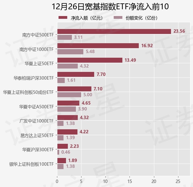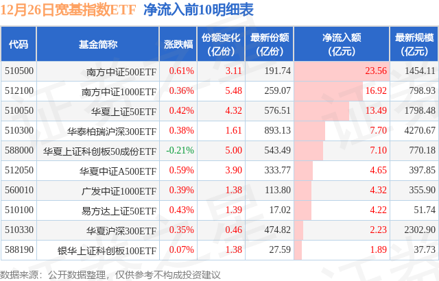 当日有53只宽基指数ETF基金出现资金净流入,其中净流入排首位的是南方中证500ETF(510500),份额增加了3.11亿份,净流入额为23.56亿元。