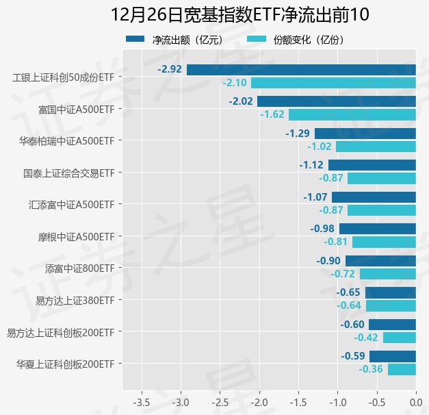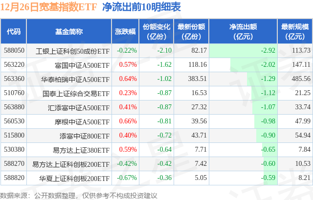 当日有69只宽基指数ETF基金出现资金净流出,其中净流出排首位的是工银上证科创50成份ETF(588050),份额减少了2.1亿份,净流出额为2.92亿元。