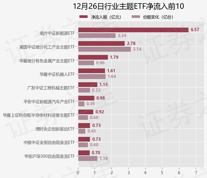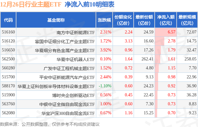 当日有66只行业主题ETF基金出现资金净流入,其中净流入排首位的是南方中证新能源ETF(516160),份额增加了2.24亿份,净流入额为6.57亿元。