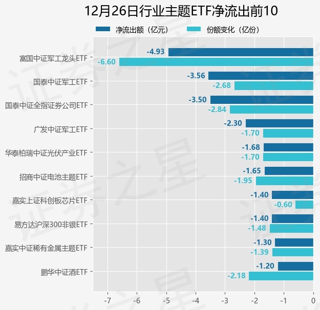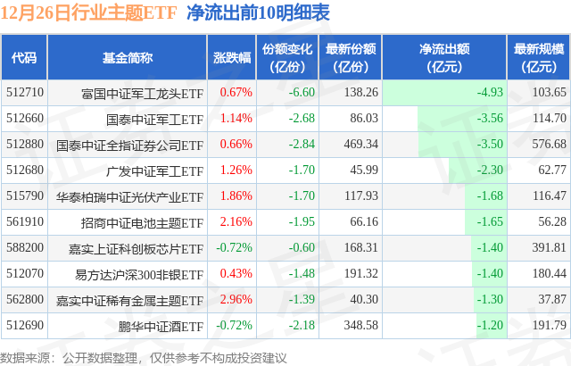 当日有161只行业主题ETF基金出现资金净流出,其中净流出排首位的是富国中证军工龙头ETF(512710),份额减少了6.6亿份,净流出额为4.93亿元。