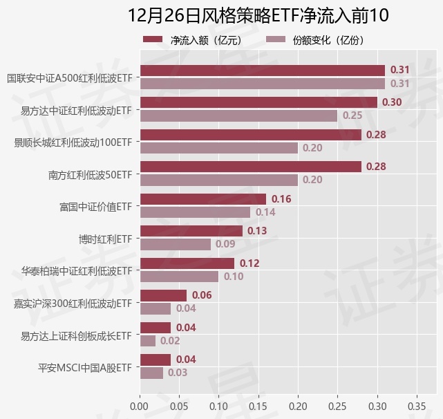 当日有12只风格策略ETF基金出现资金净流入,其中净流入排首位的是国联安中证A500红利低波ETF(560570),份额增加了3100.0万份,净流入额为3118.76万元。