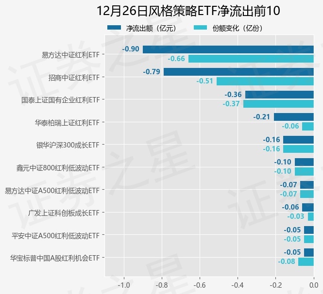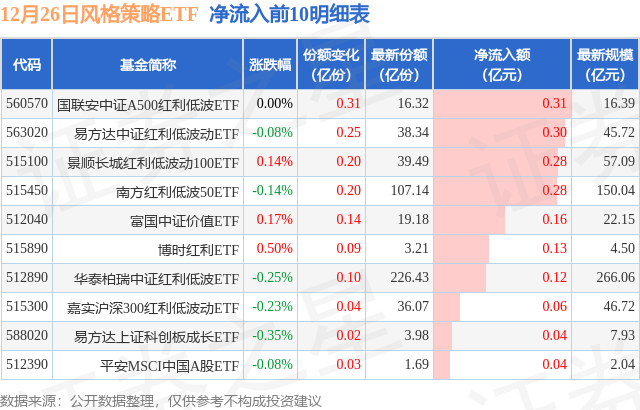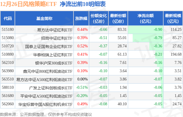 当日有16只风格策略ETF基金出现资金净流出,其中净流出排首位的是易方达中证红利ETF(515180),份额减少了6600.0万份,净流出额为9038.61万元。