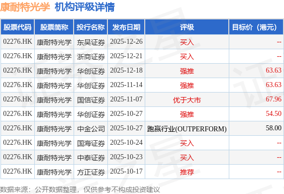 投行对该股的评级以买入为主,近90天内共有4家投行给出买入评级,近90天的目标均价为61.54港元。东吴证券最新一份研报给予康耐特光学买入评级。