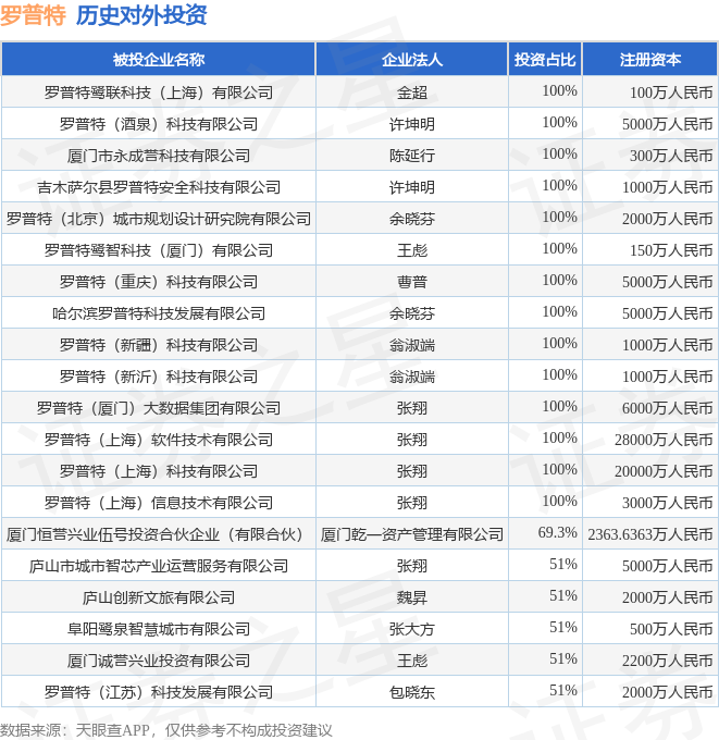 证券之星消息,根据天眼查APP显示,罗普特(688619.SH)新增一起对外投资事件,被投资公司为罗普特鹭联科技(上海)有限公司,法定代表人金超,投资占比为100%。该公司从事科技推广和应用服务业,注册资本为100万人民币。目前,罗普特共存在对外投资21项,投资占比前20的项目见下表: