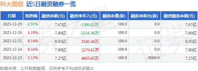 科大国创融资融券信息显示,融资方面,当日融资买入1.0亿元,融资偿还1.13亿元,融资净偿还1306.62万元。融券方面,融券卖出0.0股,融券偿还0.0股,融券余量100.0股,融券余额0.36万元。融资融券余额7.67亿元。