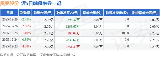 奥克股份融资融券信息显示,融资方面,当日融资买入2837.96万元,融资偿还3131.33万元,融资净偿还293.37万元。融券方面,融券卖出0.0股,融券偿还0.0股,融券余量3.04万股,融券余额30.8万元。融资融券余额2.06亿元。