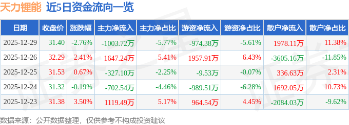 证券之星消息,截至2025年12月29日收盘,天力锂能(301152)报收于31.4元,下跌2.76%,换手率7.76%,成交量5.51万手,成交额1.74亿元。