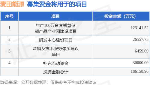 证券之星消息,麦田能源股份有限公司(简称:麦田能源)拟在深交所创业板上市,募资总金额为16.61亿元,保荐机构为国泰海通证券股份有限公司。募集资金拟用于年产100万台套智慧储能产品产业园建设项目、研发中心建设项目、营销及技术服务体系建设项目、补充流动资金,详见下表: