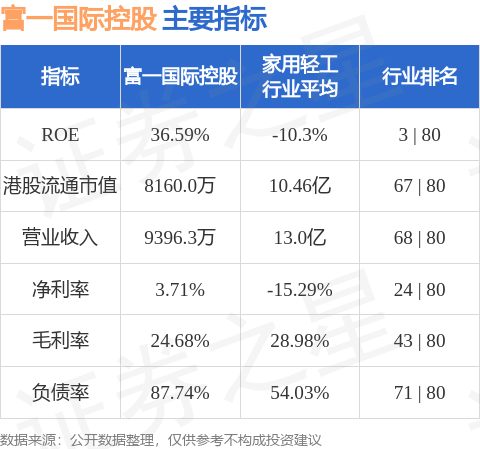 富一国际控股港股市值8160万港元,在家用轻工行业中排名第67。主要指标见下表: