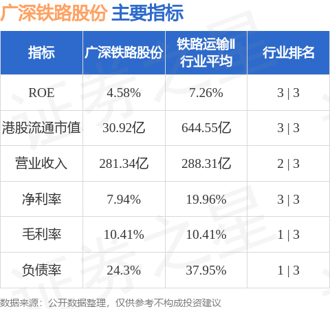 广深铁路股份港股市值30.92亿港元,在铁路运输Ⅱ行业中排名第3。主要指标见下表: