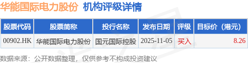 截至2025年12月31日收盘,华能国际电力股份(00902.HK)报收于5.73港元,上涨0.53%,成交量1404.95万股,成交额8068.11万港元。投行对该股的评级以买入为主,近90天内共有1家投行给出买入评级,近90天的目标均价为8.26港元。国元国际控股最新一份研报给予华能国际电力股份买入评级,目标价8.26港元。