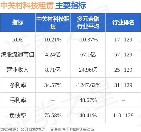 中关村科技租赁港股市值4.24亿港元,在多元金融行业中排名第57。主要指标见下表: