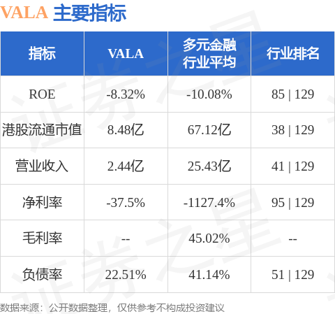 VALA港股市值8.48亿港元,在多元金融行业中排名第38。主要指标见下表: