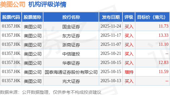 投行对该股的评级以买入为主,近90天内共有6家投行给出买入评级,近90天的目标均价为12.12港元。国金证券最新一份研报给予美图公司买入评级,目标价11.73港元。