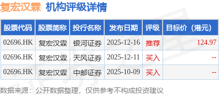 投行对该股的评级以买入为主,近90天内共有2家投行给出买入评级,近90天的目标均价为124.97港元。银河证券最新一份研报给予复宏汉霖推荐评级,目标价124.97港元。