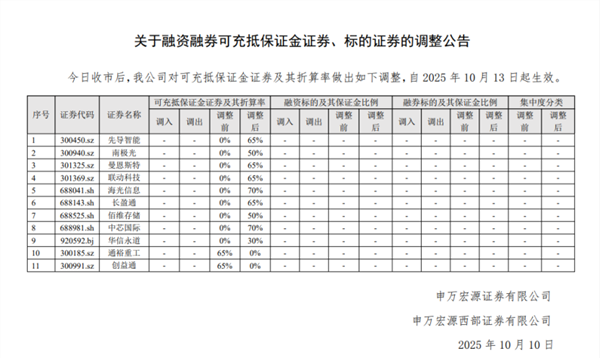 10月10日,申万宏源证券发布关于融资融券可充抵保证金证券、标的证券的调整公告。公告称,10月10日收市后,申万宏源证券对可充抵保证金证券及其折算率做出如下调整,自2025年10月13日起生效。