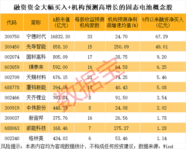 从未来增长潜力来看,根据5家以上机构一致预测,今明两年净利润增速均超20%的固态电池概念股有16只。这16股中,部分股票近期获得融资资金大手笔加仓。数据宝统计,截至10月9日收盘,9月以来融资净买入超1亿元的有11只,宁德时代、先导智能、国轩高科、璞泰来、天赐材料等融资净买入额居前。