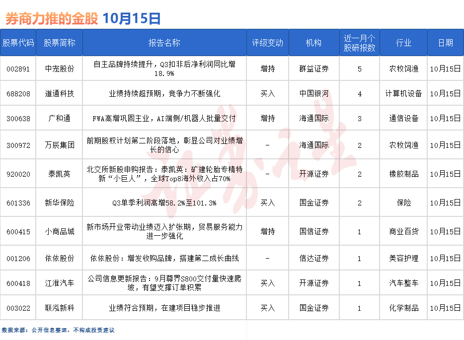 除了上述个股外,还有万辰集团、泰凯英、新华保险、小商品城、依依股份、江淮汽车、联泓新科等多股备受券商关注。