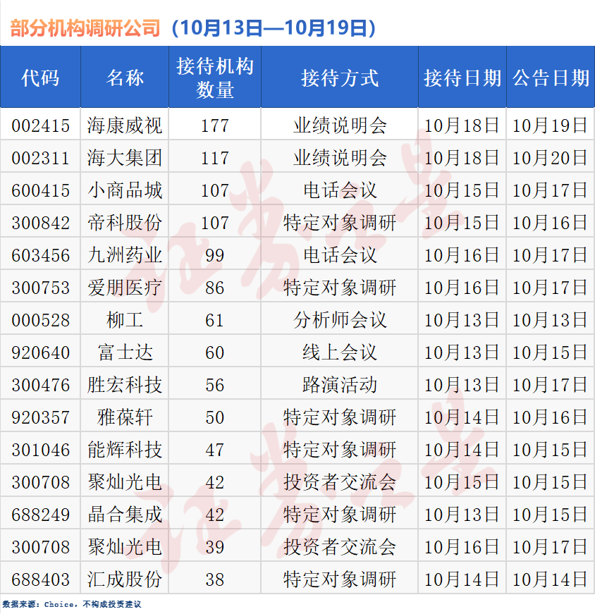 根据Choice数据的最新统计,在刚刚过去的一周(10月13日至10月19日),超200家上市公司迎来了机构的调研,这一数字不仅反映了资本市场对这些企业的浓厚兴趣,也暗示了市场对这些领域未来发展的期待和信心。