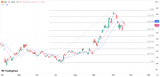 在市场看好公司云计算和人工智能业务的增长前景改善下,阿里巴巴已成为9月港股市场表现最佳的科技股巨头,当月累计上涨53%,9月份,南向资金净买入阿里巴巴股票共计610亿港元,是今年迄今为止单月净买入量最高的一个月。10月份股价则部分跟随国际贸易形势带来的影响而出现回吐,本月刷新2021年8月以来高位后倒跌逾8%。