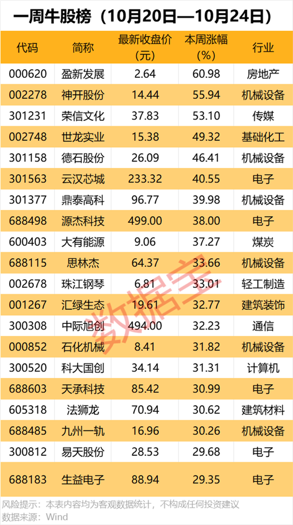 涨幅居前的个股中,神开股份、荣信文化、世龙实业、德石股份、云汉芯城本周累计涨幅均在40%以上。