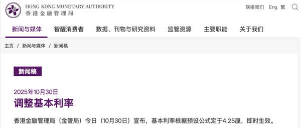 10月30日,香港金融管理局(以下简称香港金管局)将基准利率下调25个基点至4.25%,即时生效。