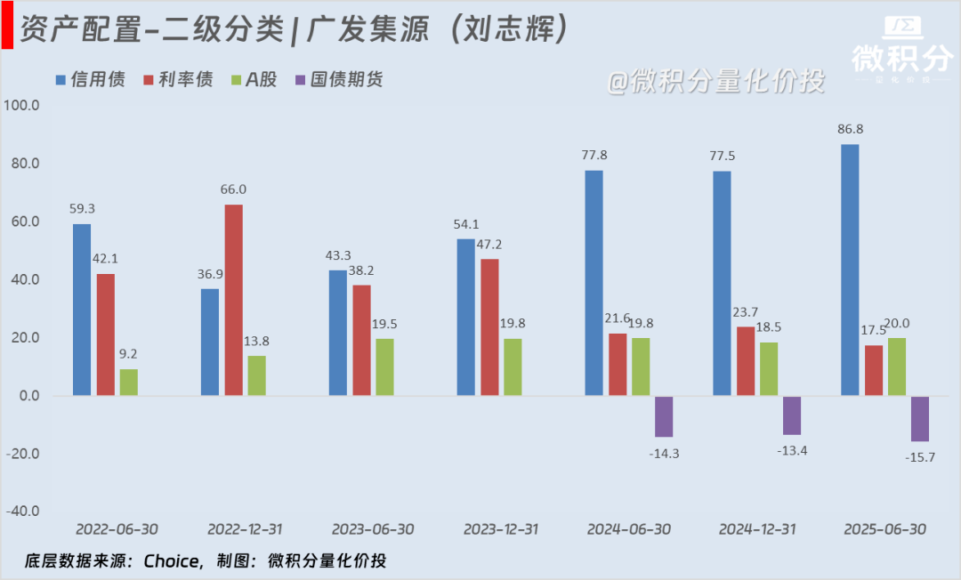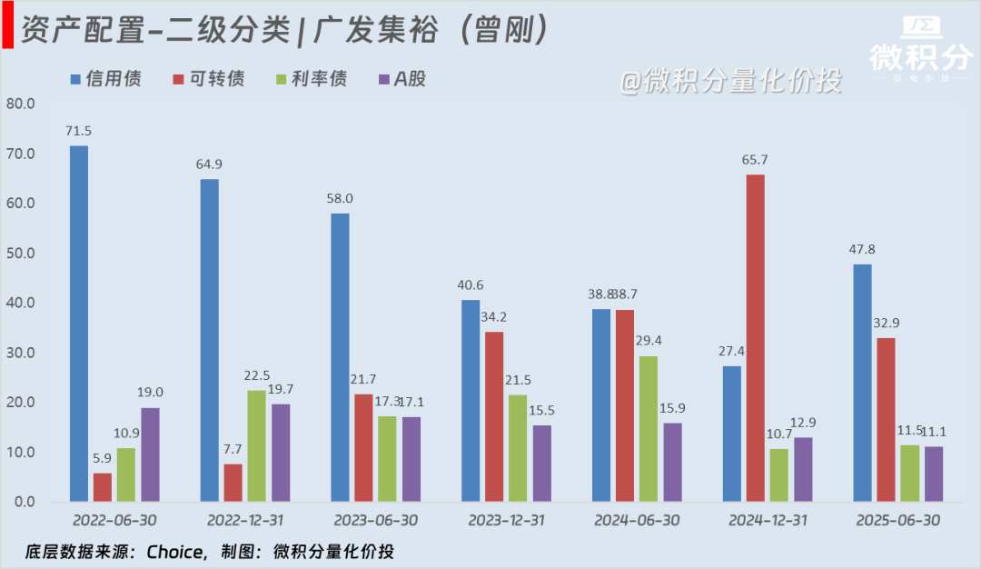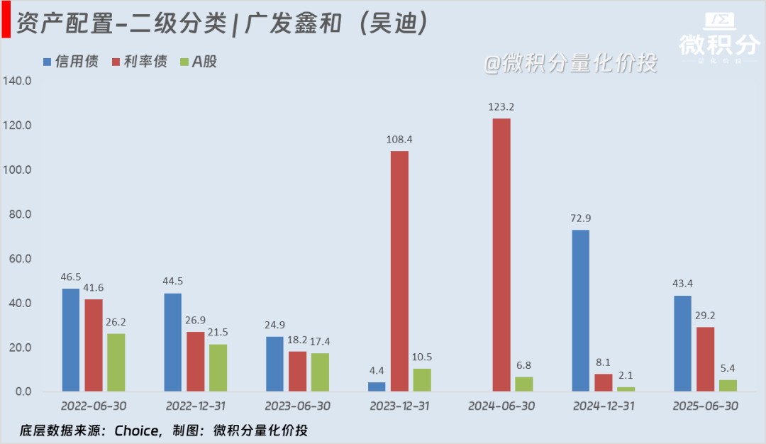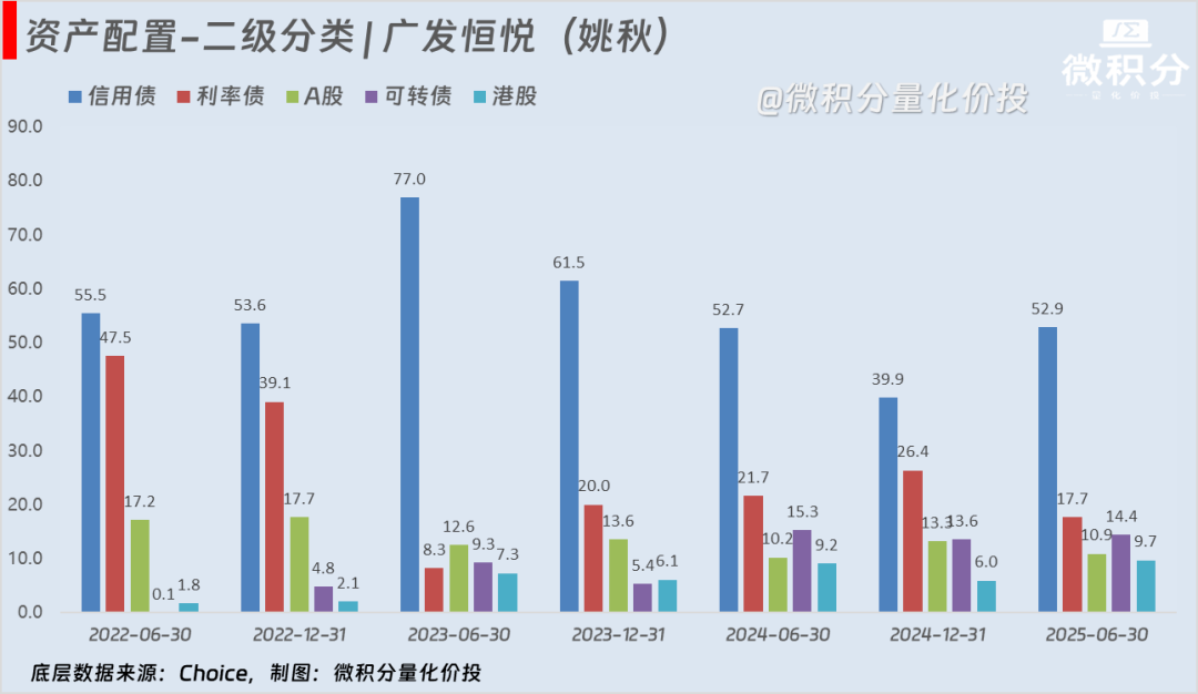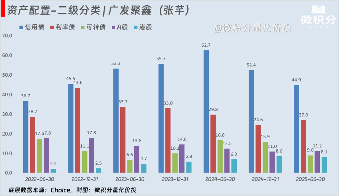 在债券内部,“信用债”是绝对主力,占比远超“利率债”,表明其在固收部分偏好通过信用挖掘来获取收益。