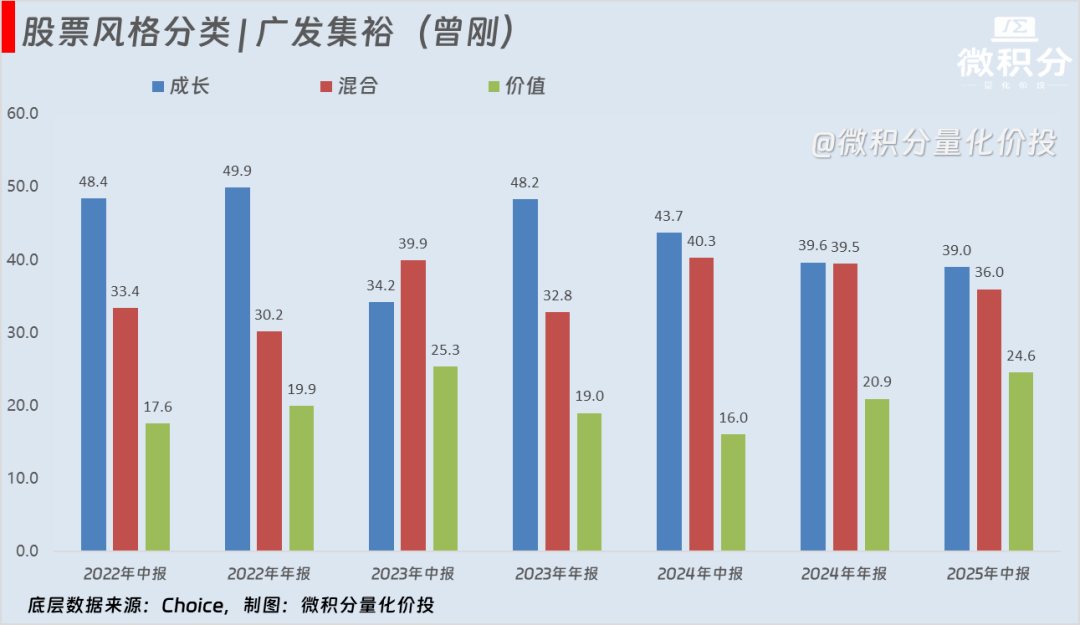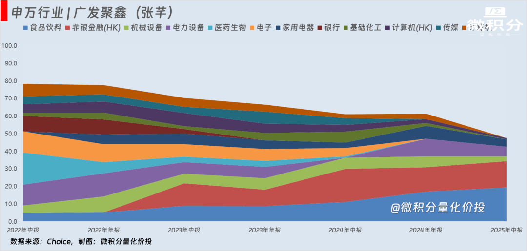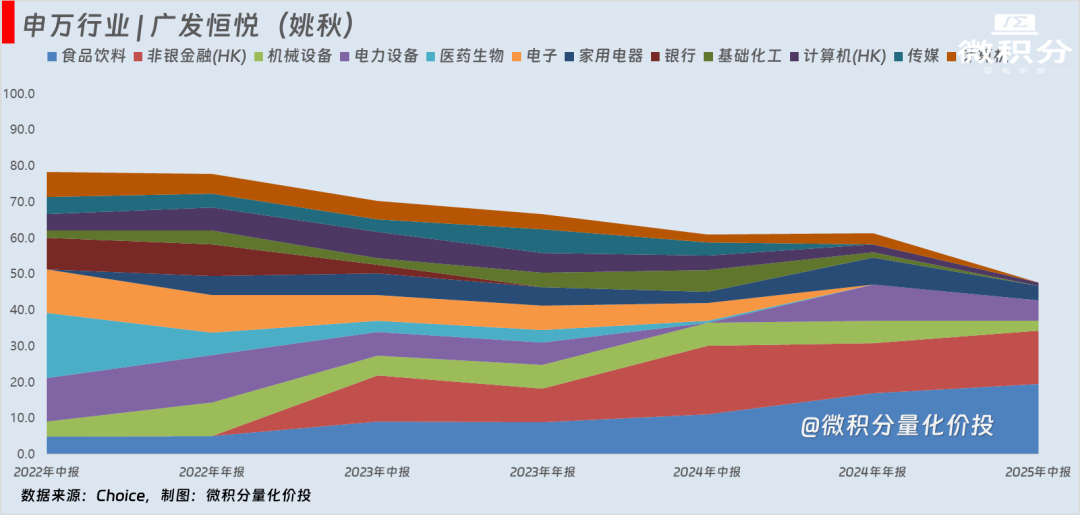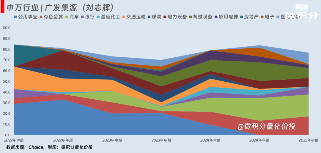 行业轮动灵活:虽然整体均衡,但在不同阶段也有清晰的结构调整。例如,在2024年中报增加了对周期(有色金属)和金融地产(保险)的配置,而在2025年中报则显著增配了新能源(电力设备)和TMT(电子)。
