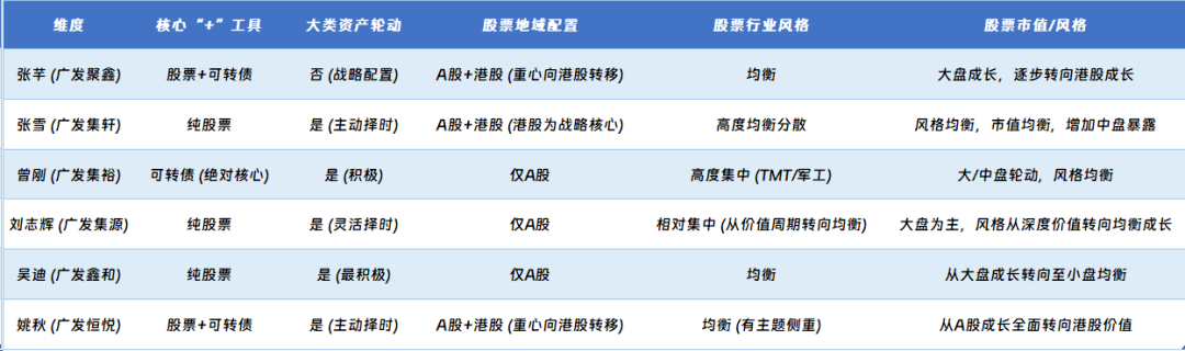 通过上面这张表,我们可以在资产配置、增强收益的工具、股票配置及投资风格等维度看出6位基金经理的差异度:
