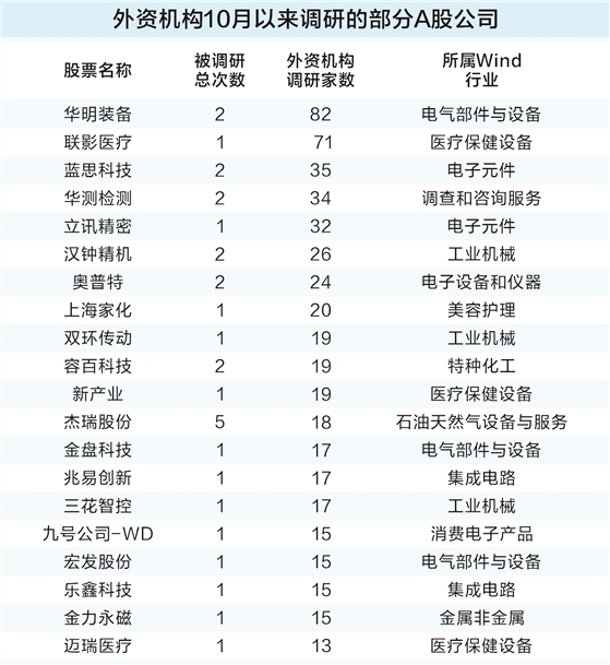 Wind数据显示,10月以来,外资机构合计调研了309家A股上市公司,主要集中在工业机械、电气设备、电子元件、医疗等行业。