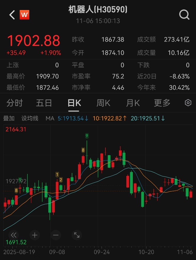 今日,机器人指数(H30590)结束连日调整实现强势反弹,日上涨 1.9%,成交金额达 273.41 亿元,较前一交易日的 236.61 亿明显放量,资金进场意愿增强。