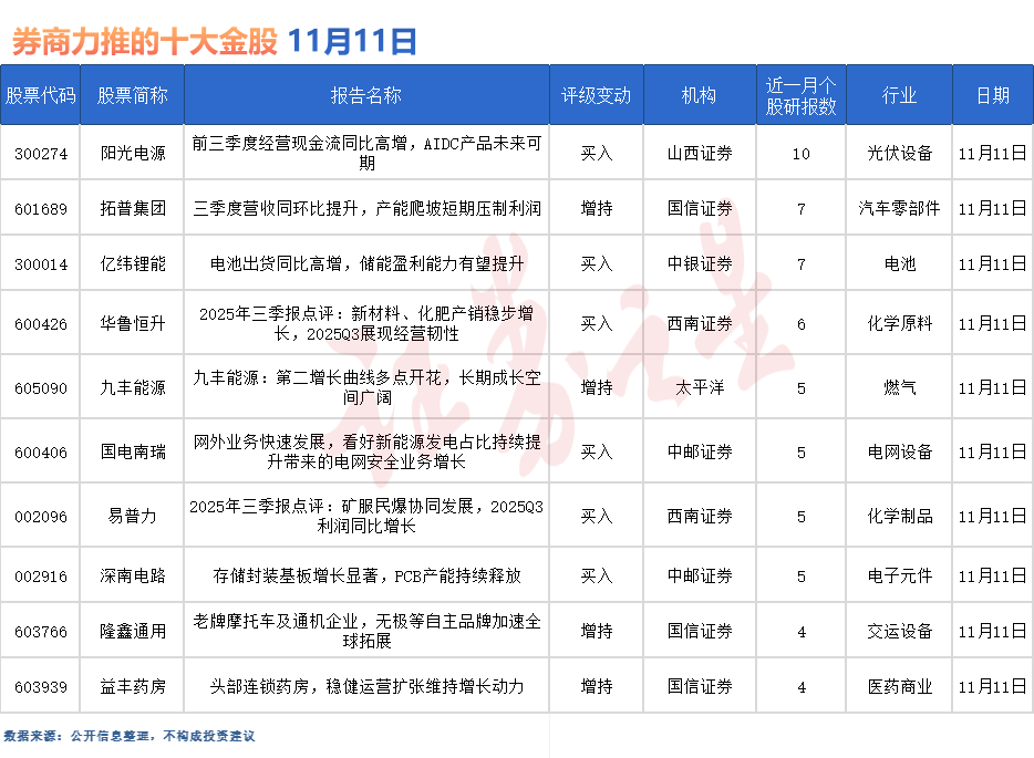阳光电源最受券商关注,近一个月获华安证券、华龙证券、中国银河、民生证券、交银国际证券、开源证券、东吴证券等10份券商研报关注,位居11月11日券商力推股榜首。