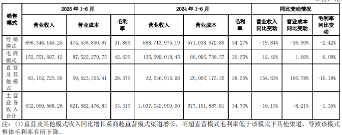直营渠道的调整也未能扭转公司整体营收下滑的颓势。短期来看,经销模式仍是公司基本盘,上半年经销商数量净增354个。然而,该渠道上半年贡献的收入却同比下降19.84%,至6.96亿元。对于“量增额减”的情况,公司管理层解释为上半年主动收缩了部分低效产品,但这也表明,新增经销商的产出效能尚不足以弥补产品线调整带来的收入缺口。
