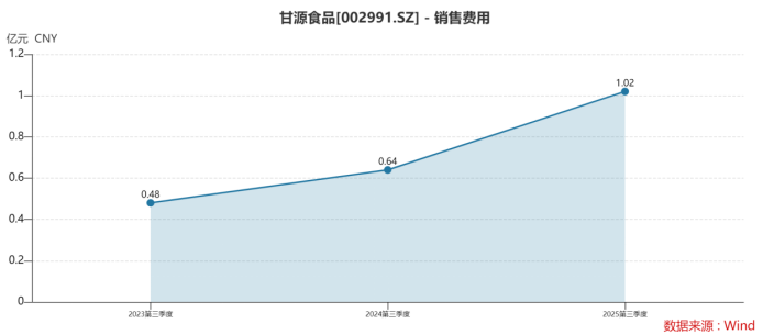 今年第三季度,甘源食品投入销售费用1.02亿元,同比激增59.38%,对应的销售费用率约为17.35%,同比增长5.9个百分点。受此影响,公司单季度的净利率约为12.9%,虽环比有所回升,但同比仍下滑5.4个百分点。