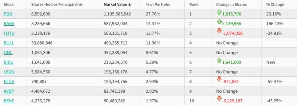 此外,阿里亦成为高瓴本季最大增持标的,持仓规模环比大增186%。重新回到第二大重仓位置。