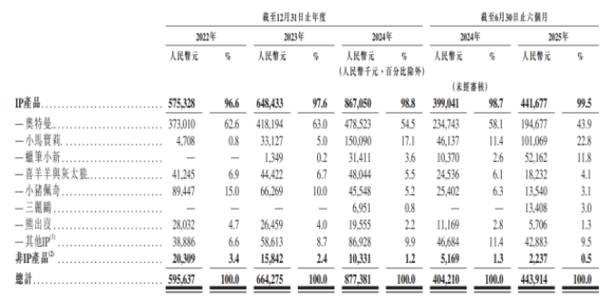值得注意的是,IP产品收入已占公司总收入的九成以上,且营收占比呈逐年上升的趋势。2022年,公司来自IP产品的收入为5.75亿元,占总收入的比重为96.6%。2024年,该比重增长至98.7%,到了2025年上半年,该比例进一步攀升至99.5%。
