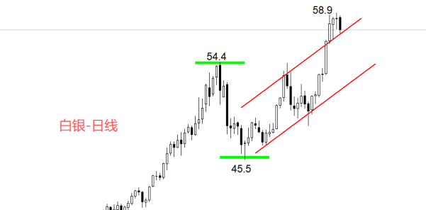 ATFX金属:11月24日至12月1日,国际白银价格走势靓丽的六连阳走势,最高价触及58.8美元,距离60美元整数关口仅一步之遥。如果60美元关口被快速的有效突破,白银还将迎来新一轮强势上涨。反之,如果行情止步60美元,无力创出新高,则多头信心受挫,在关键阻力位的压制下,白银有可能出现深度回调走势。