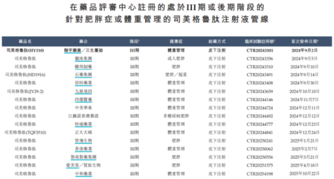 蔓迪国际在体重管理领域的业务储备或许更受外界关注。招股书显示,公司用于体重管理的长效型GLP-1受体激动剂—司美格鲁肽注射液,正在中国进行III期临床试验,目标于2026年上半年提交药品注册申请。公司称,该产品有望成为中国首批获批用于体重管理的国产司美格鲁肽制剂。