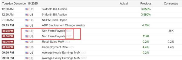 本周二21:30,美国劳工部劳动统计局,将公布美国10~11月非农就业报告。由于美国政府停摆从10月1日持续至11月12日,所以本次公布的非农就业报告的基础数据存在无法采集、无法追溯的问题。美国劳工部的处理方法是,合并10月和11月的数据,不再逐月单独公布。这也意味着,本次非农公布的数据并未完全覆盖两月的数据,而是“有多少基础数据就公布多少数据”。美国10~11月非农就业人口变动的前值为11.9万人,预期值为3.5万人,市场预期非常悲观。美国自动数据处理公司公布的11月小非农ADP数据是-3.2万人,就业市场已经开始萎缩,该数据显著拉低了市场预期。如果本次非农数据符合市场预期,美国就业市场衰退迹象就得到确认,美联储2026年潜在降息幅度和次数将升高,美元指数将持续承压。