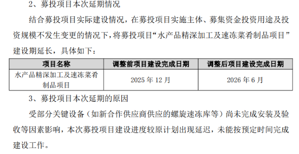 近日,海欣食品(002702.SZ)发布公告称,将2023年定增募投的“水产品精深加工及速冻菜肴制品项目”(下称“水产品项目”)延期至2026年6月,这已是该项目第二次延期。