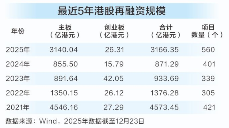 Wind数据显示,2025年港股再融资规模达到3166亿港元,远超2022年至2024年的规模,甚至接近过去三年的总和——3181亿港元。同时,在再融资的项目数量上,2025年的再融资项目达到560个,远超过去数年的均值。