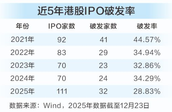 在2025年,港股IPO不仅有量的提升,IPO质地同样不俗,IPO破发率创近年新低,打新赚钱效应凸显。整理Wind数据显示,2025年是最近5年港股IPO破发率最低的一年,破发率为28.83%。