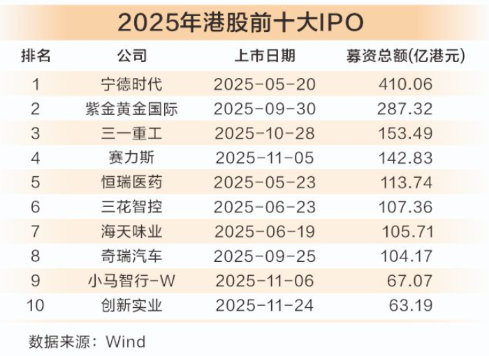 2025年港股IPO规模能够重返全球第一,离不开宁德时代、紫金黄金国际等大型IPO的助力,二者分别为今年全球第一大和第二大IPO。Wind数据显示,2025年港股前十大IPO中,有8家公司超百亿港元。
