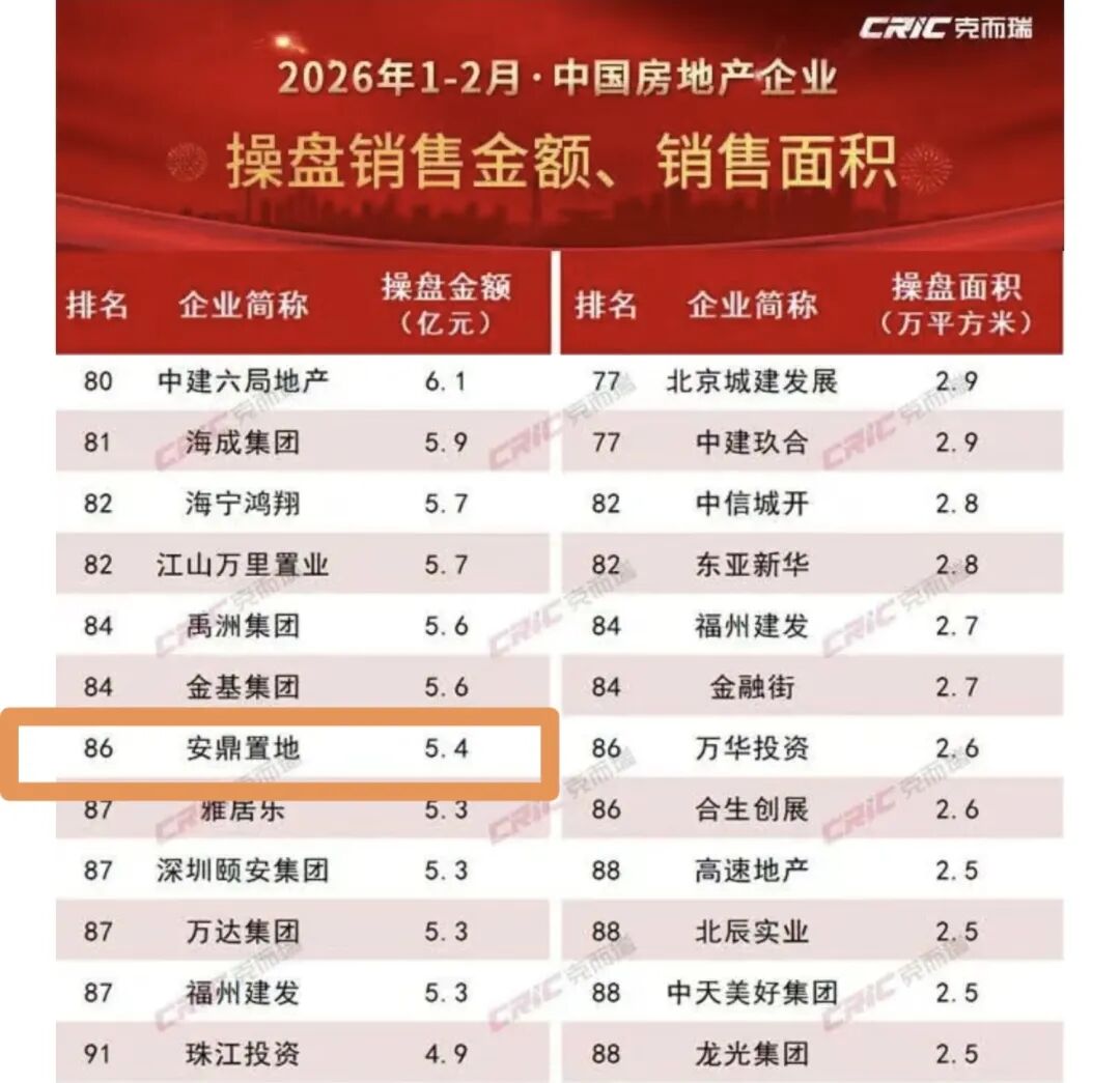 今年1-2月房企操盘销售榜单发布,安鼎置地冲进百强,排名86,5.4亿,比雅居乐、万达集团还高,令很多人意外。