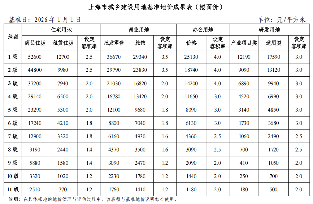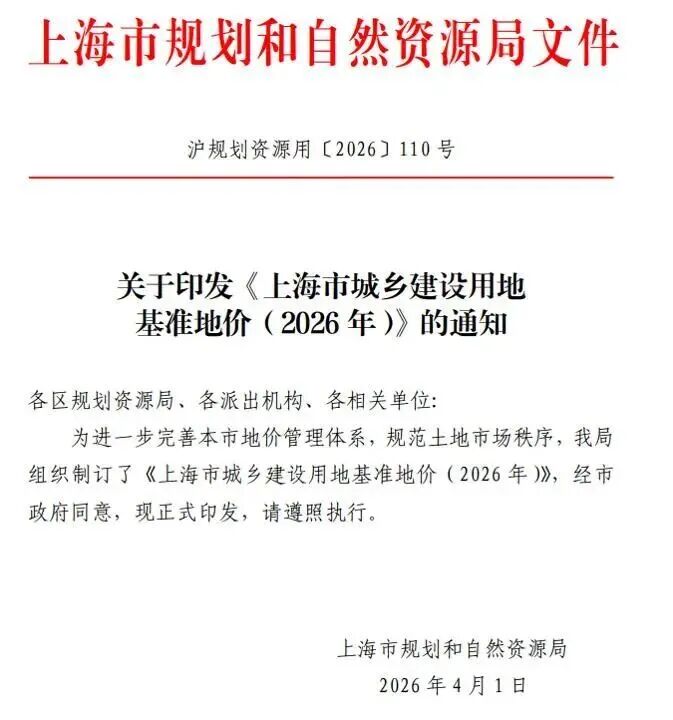 2026年4月1日,《上海市城乡建设用地基准地价(2026年)》正式发布。此次更新将基准日从2020年1月1日调整至2026年1月1日,并对全市土地价格体系进行了系统性重构。
