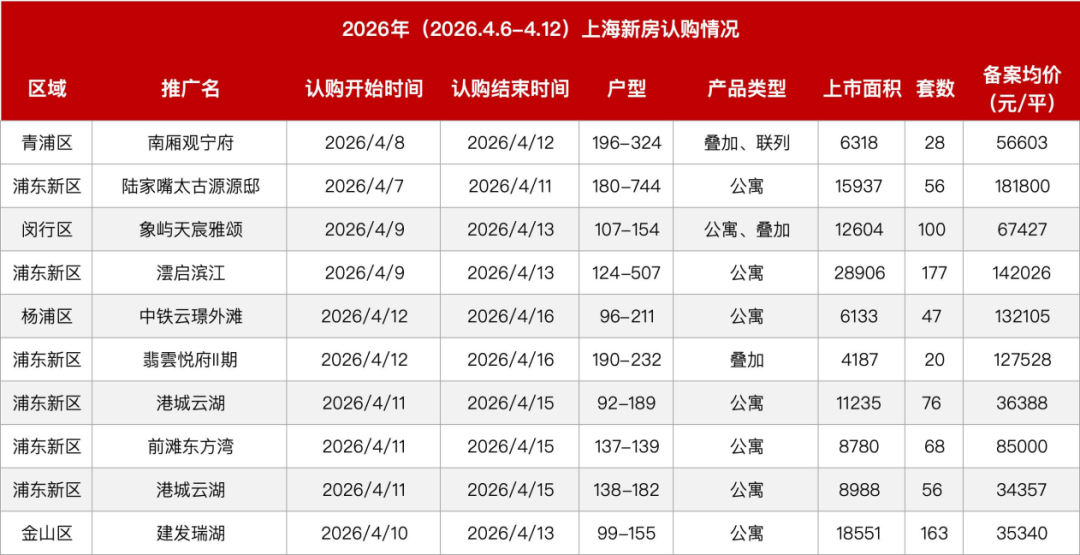 闵行保利都汇和煦,84套公寓,备案均价73297元/平方米,称6小时售出61;松江的中国铁建西派云间——56套公寓及叠加,备案均价61221元/平方米,60组认购,认购率107%,开盘当日去化约80%。